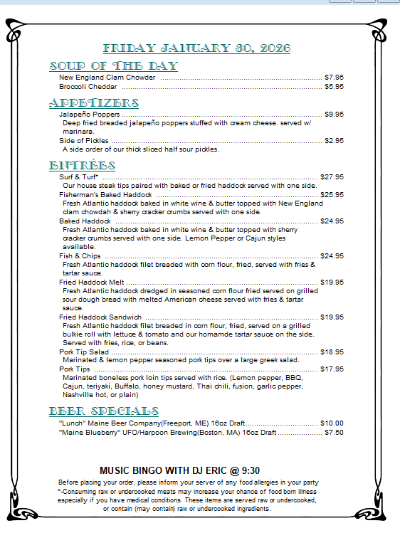 Our restaurant mainly specializes in and is famous for Angus steak tips. You'll also find dinner salads that are topped with chicken or beef and the best Reuben you'll find in North Shore. We only use fresh ingredients to give you the best dining experience. From famous our Meatloaf to Friday night Fish and Chips, we have specials every day in our lunch and dinner menu.